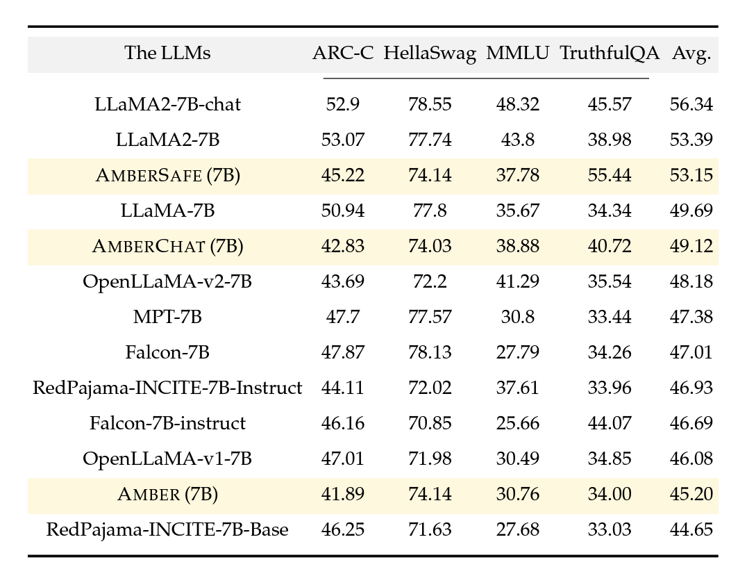 Amber is the inaugural member of the LLM360 family, accompanied by its fine-tuned versions: AmberChat and AmberSafe. Amber adopts a model architecture consistent with LLaMA 7B, and we adhere closely to LLaMA's hyperparameters. We notice that Amber performs well in MMLU but slightly worse on ARC.